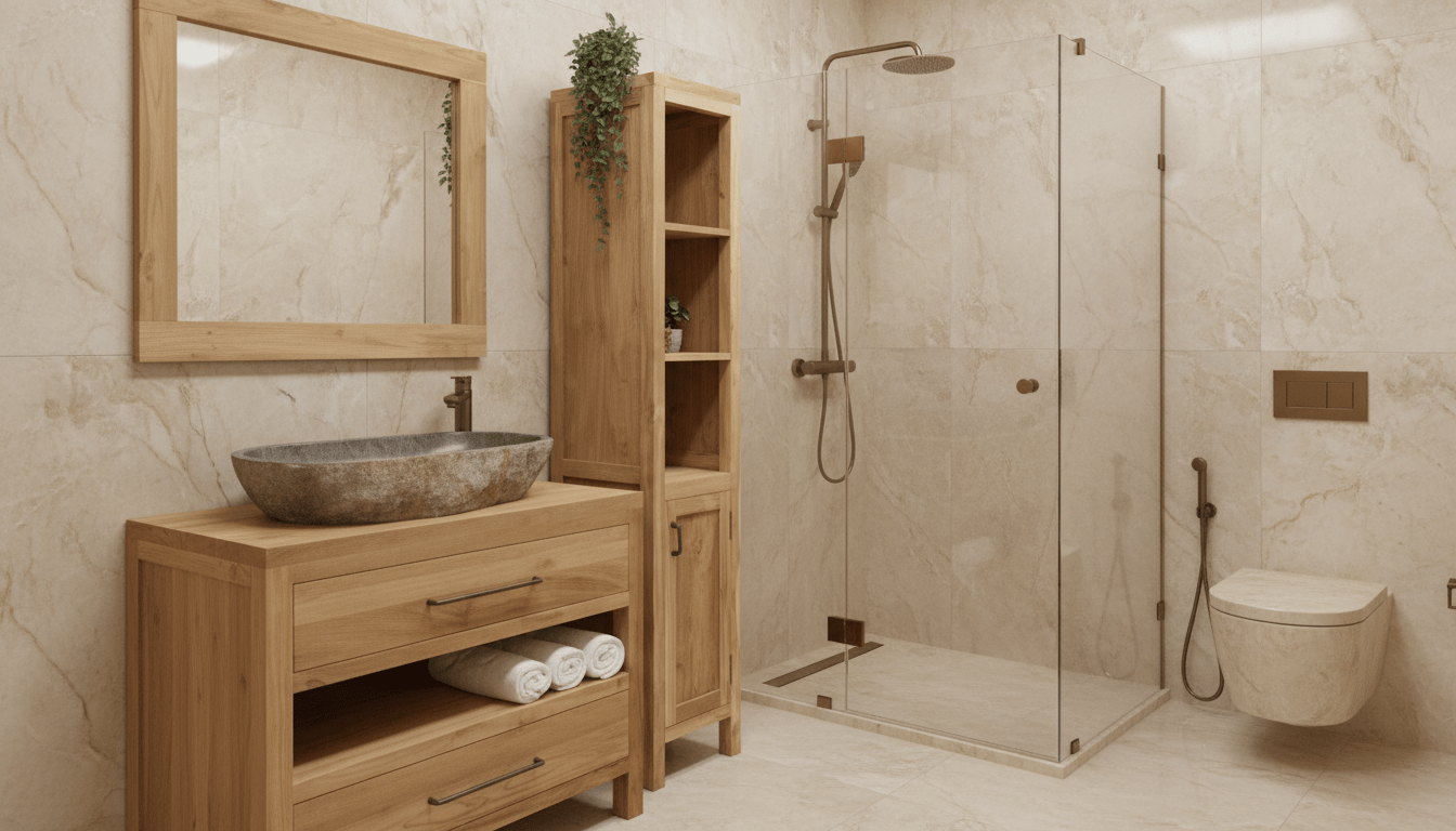 De Puurteak badmeubel set 110 cm Naturel vormt een elegante totaaloplossing voor wie een stijlvolle en duurzame badkamerinrichting zoekt. Deze set bestaat uit een teakhouten badkamermeubel van 110 cm breed, een bijpassende hoge kast, een spiegel en een ovale wasbak — alles zorgvuldig op elkaar afgestemd. Volgens de productpagina is het meubel gemaakt van gerecycled teakhout, wat een robuuste, natuurlijke uitstraling geeft die uitstekend past in vochtige ruimtes.