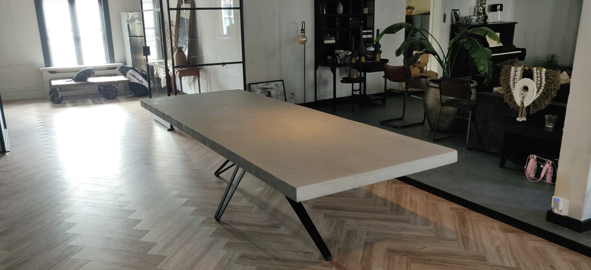 Tafels met een tafelblad met betonlook hebben een industriële en stoere uitstraling en zijn verkrijgbaar met verschillende stalen tafelpoten en onderstellen. De betontafels van Woodindustries worden in de eigen werkplaats gemaakt. Het team van meubelmakers maakt de betontafels vanaf de basis helemaal zelf met beton ciré, dat na het droogproces een mooi robuust uiterlijk krijgt.