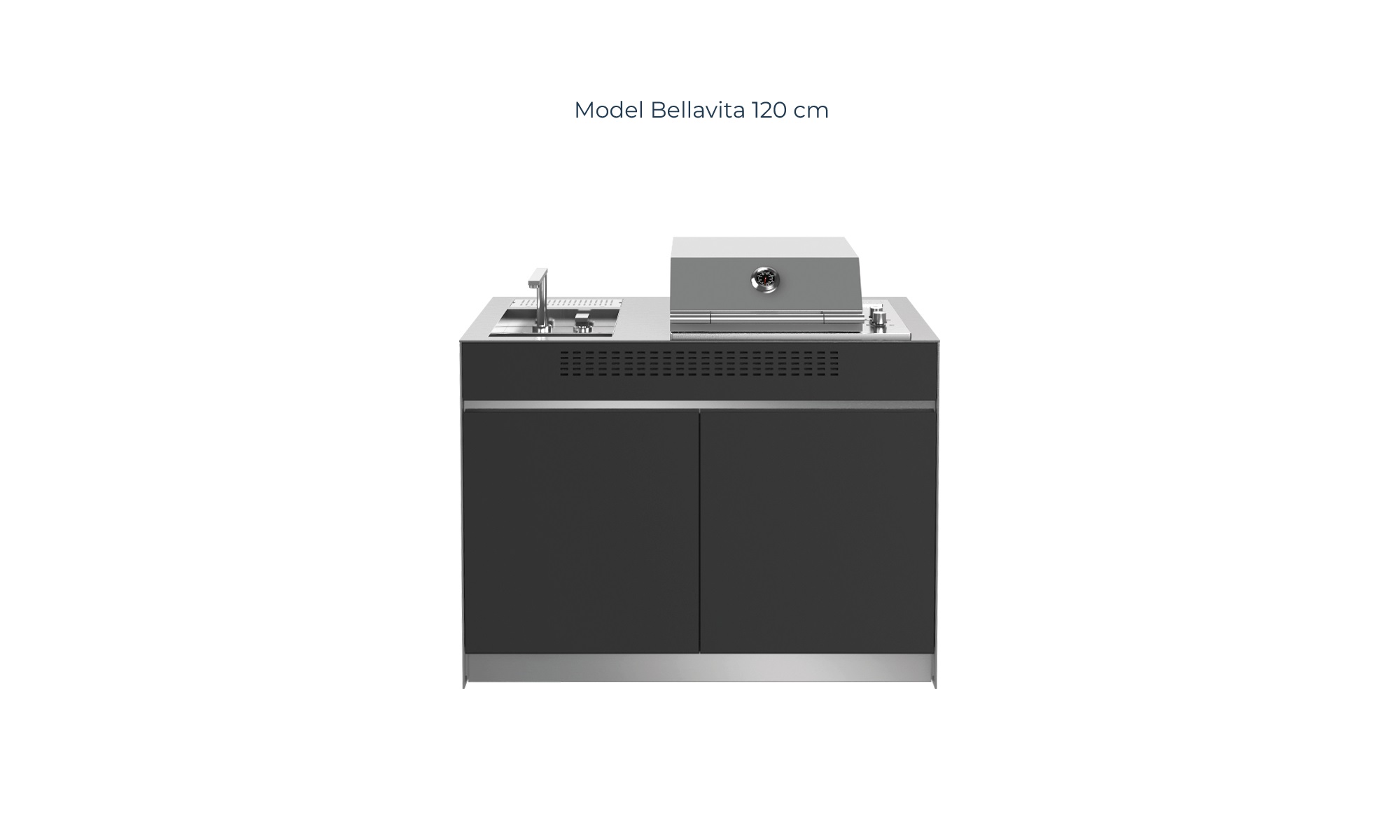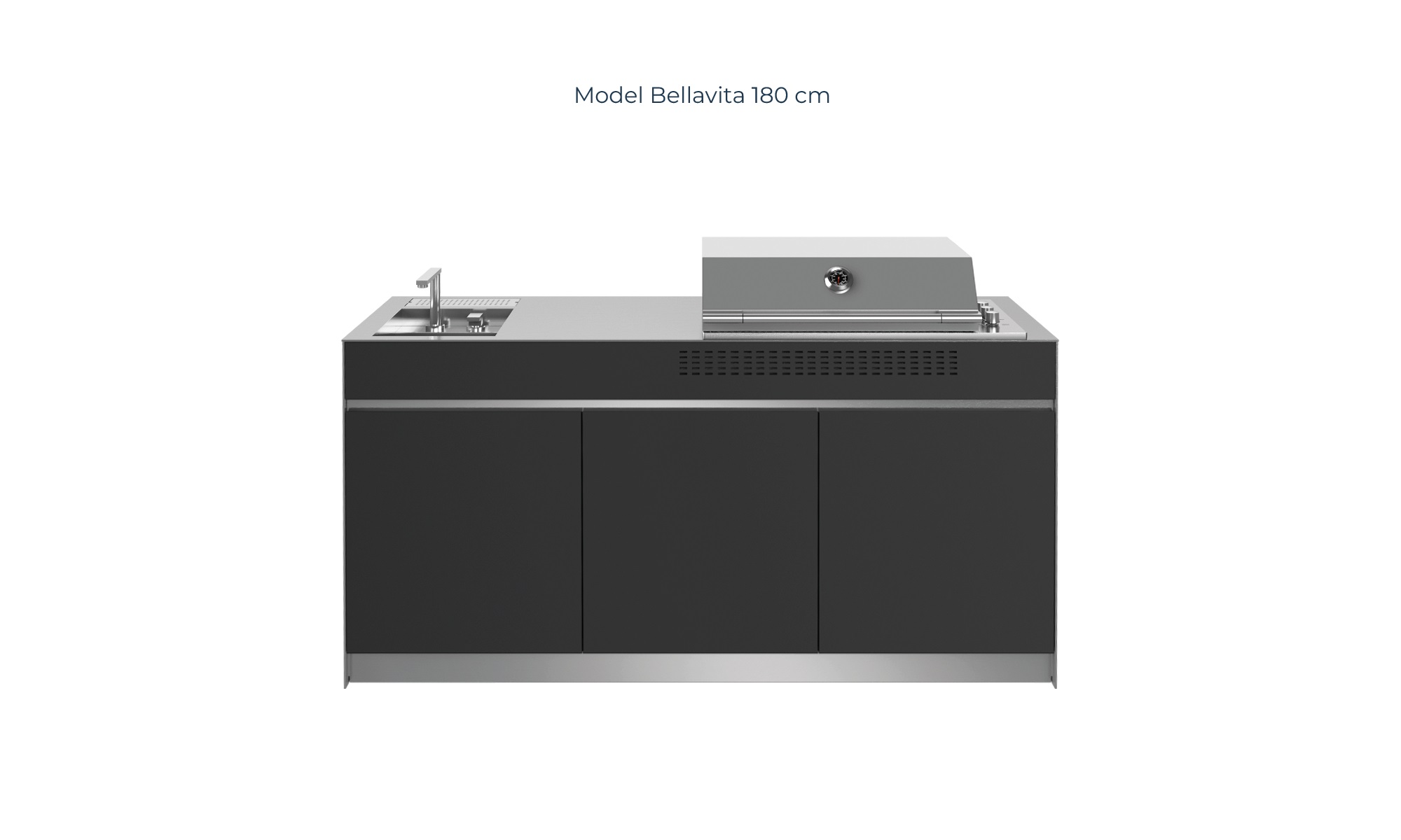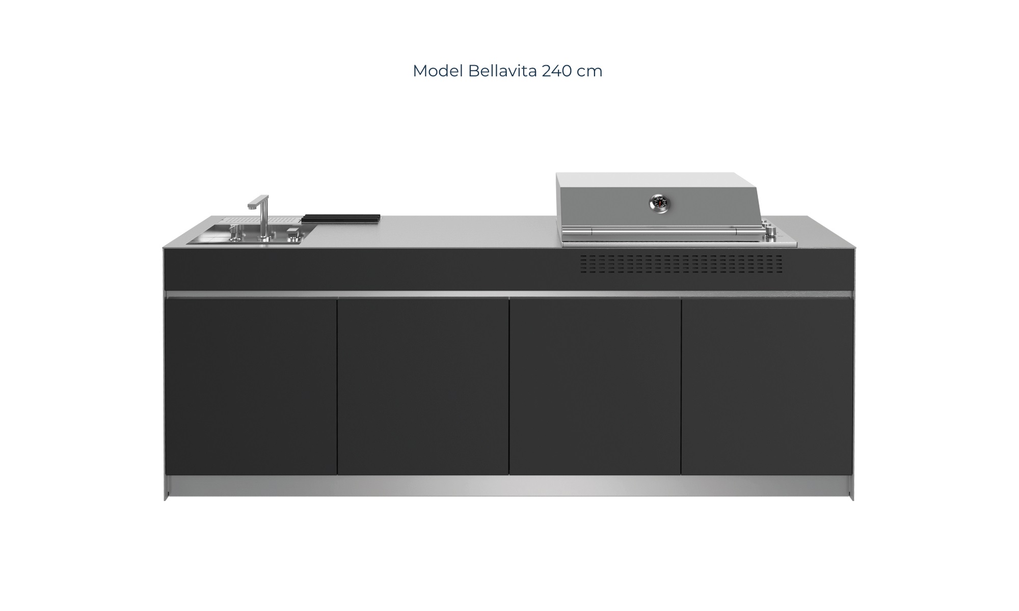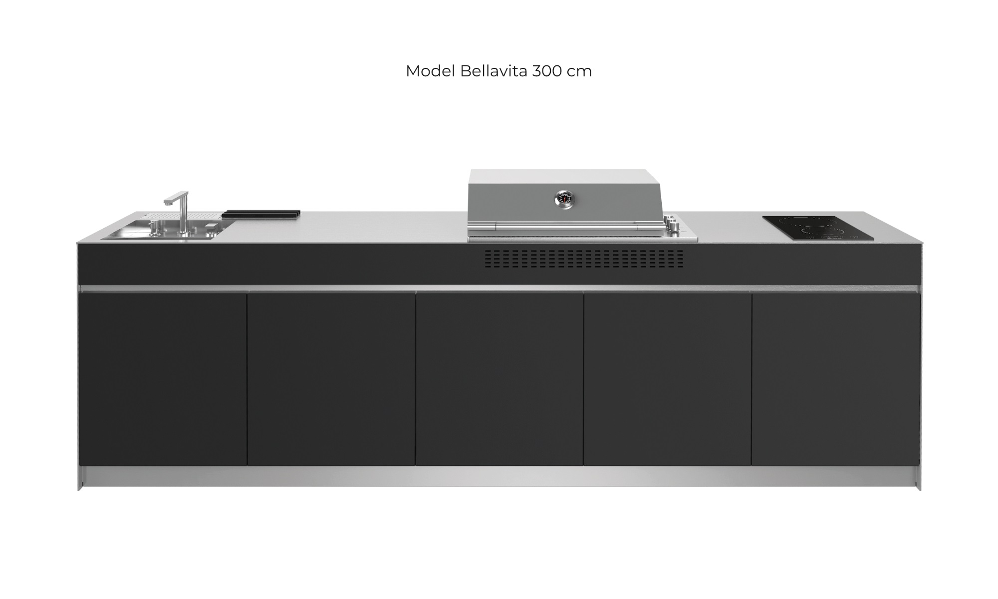Om uw ervaring van het buiten koken en entertainen van vrienden nog completer te maken, kunnen de 240 cm en 300 cm brede modellen optioneel worden uitgerust met een wijnkoelkast of een ijsblokjesmachine. Deze toevoegingen maken het mogelijk om uw gasten altijd te voorzien van perfect gekoelde drankjes, wat zorgt voor een nog aangenamere en luxere buitenbeleving. Daarnaast kan het Bellavita-model worden uitgebreid met een schuiflade module voor het opbergen van kookgerei en een uittrekbaar afvalladesysteem voor extra gemak en hygiëne tijdens het koken.