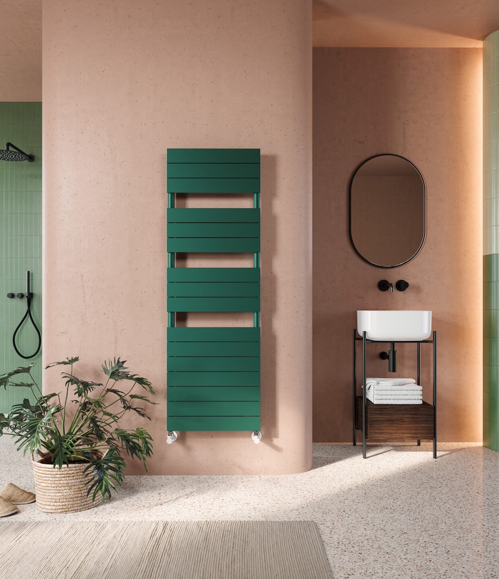 De DECO–LIGHT is een badkamerradiator met een strak en praktisch ontwerp. De twee verticale collectorbuizen vormen de basis, met daarop rechthoekige panelen van 77 x 10 mm. Tussen de panelen zit een subtiele opening van 3 mm waardoor de radiator een elegante uitstraling krijgt. Tegelijk zorgen de ruime openingen voor een handige plek om handdoeken op te hangen, zodat een warme handdoek altijd binnen handbereik is.
