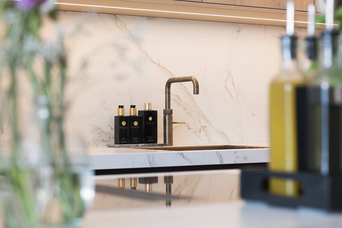 Het kookeiland is uitgerust met een geïntegreerde kookplaat met afzuiging, waardoor het werkblad vrij blijft en de keuken een ruimtelijk karakter behoudt. Aan de korte zijde is een bar gecreëerd, ideaal voor een snel ontbijt of een informele ontmoeting tijdens het koken. De subtiele ledverlichting onder de bovenkasten en in de nis benadrukt de textuur van het hout en creëert in de avond een aangename sfeer.