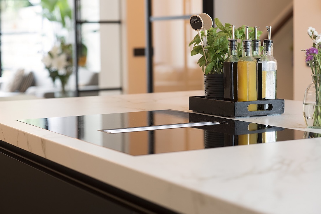 In Den Haag realiseerde Kitchenstudio een keuken met eiken fineer en zwart kookeiland, waarin warmte, contrast en functionaliteit samenkomen. Het ontwerp is afkomstig uit het Kitchenstudio Private Label, geproduceerd door de DKG fabriek waar ook keukens van Keller en Bruynzeel worden gemaakt. Deze samenwerking garandeert hoogwaardige kwaliteit en afwerking, met het herkenbare striklogo als subtiel kenmerk van het label.