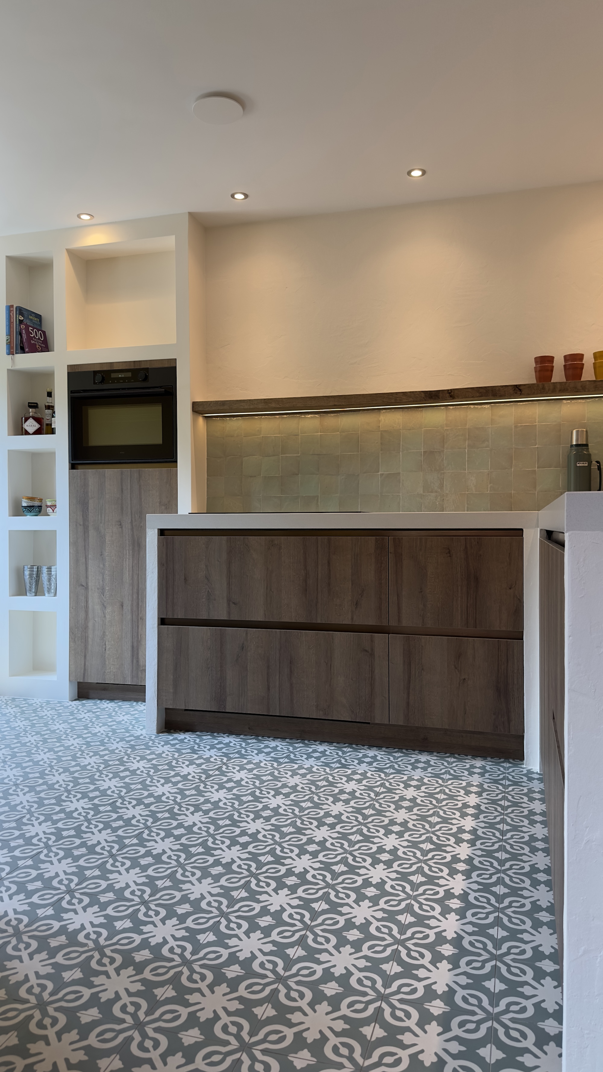 De Azule 09 Olive is een handgemaakte Portugese cementtegel van 20x20 cm en 1,6 cm dik. Met zijn speelse patroon en vrolijke kleuren geeft hij meteen karakter aan elke ruimte. Dankzij de levendige kleurnuances en het matte oppervlak krijgt iedere vloer een unieke en stijlvolle uitstraling. Bovendien zijn er bijpassende rand- en hoektegels verkrijgbaar, waardoor je een compleet patroon kunt leggen. Perfect voor wie houdt van een opvallende, persoonlijke touch in huis. Deze tegels brengen gegarandeerd een frisse en creatieve vibe in elke ruimte!