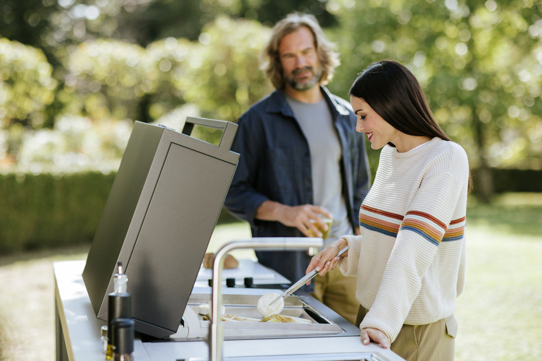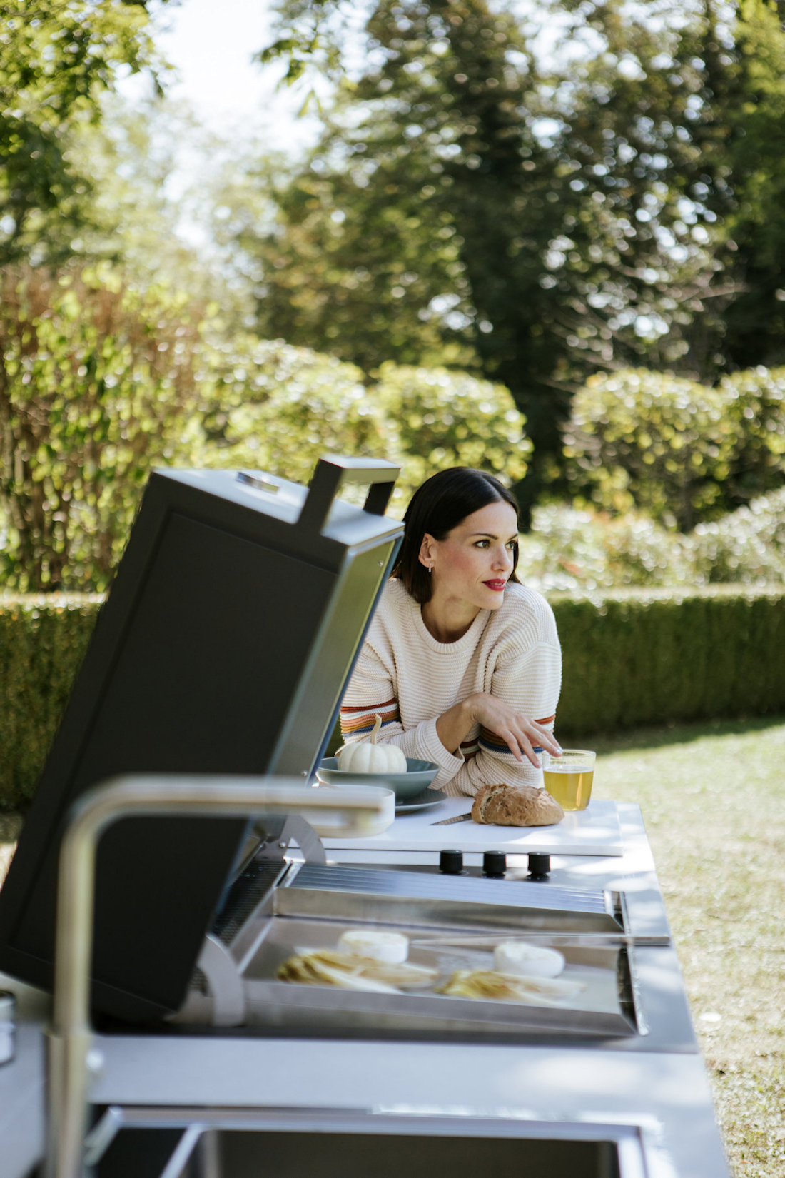 Modulariteit is het kloppende hart van de Fògher-filosofie en komt volledig tot uiting in de Agher buitenkeuken. Net zoals de esdoorn naadloos in de natuur integreert, kunnen de twee uitsparingen van het MDI-werkblad (een innovatief oppervlak gemaakt van natuurlijke mineralen) naar wens worden ingevuld met kookapparatuur.
