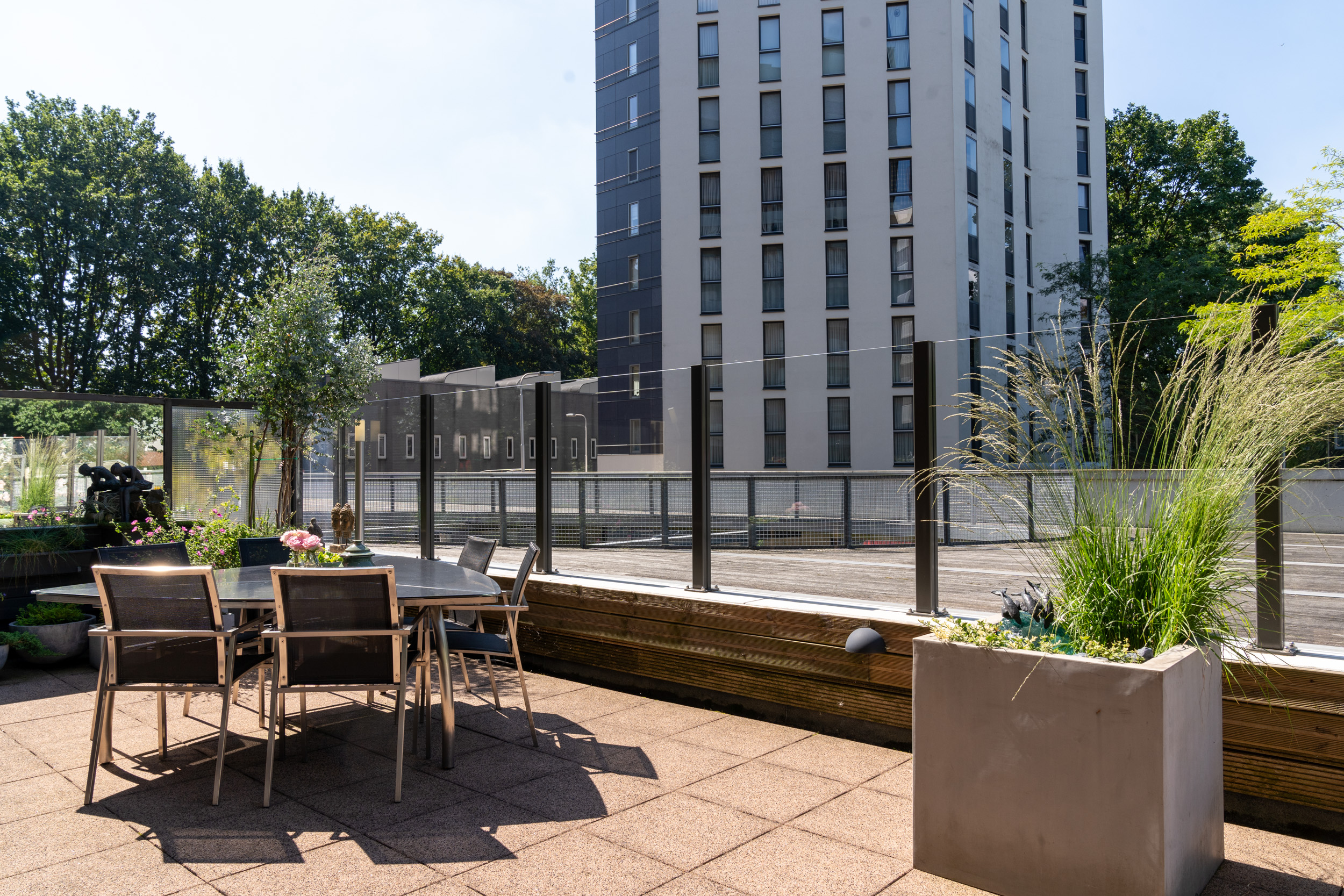 Een glazen windscherm creëert luwte op plekken waar wind normaal gesproken hinderlijk is. Dat betekent minder koude wind langs het terras, minder opwaaiende kussens en een prettiger zitklimaat. Zo kunt u eerder in het jaar buiten zitten en juist later in het najaar nog steeds comfortabel buiten eten, borrelen of ontspannen.