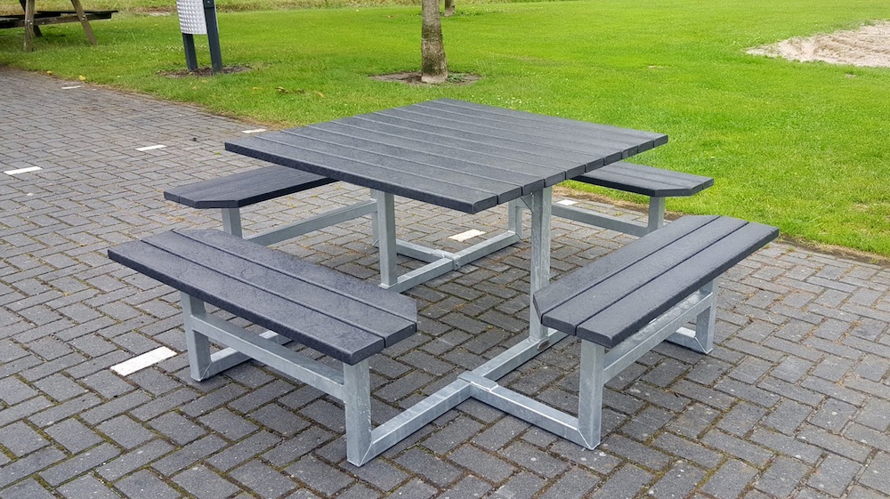 De tafels zijn vervaardigd uit duurzame, gerecyclede materialen, bestand tegen alle weersinvloeden.