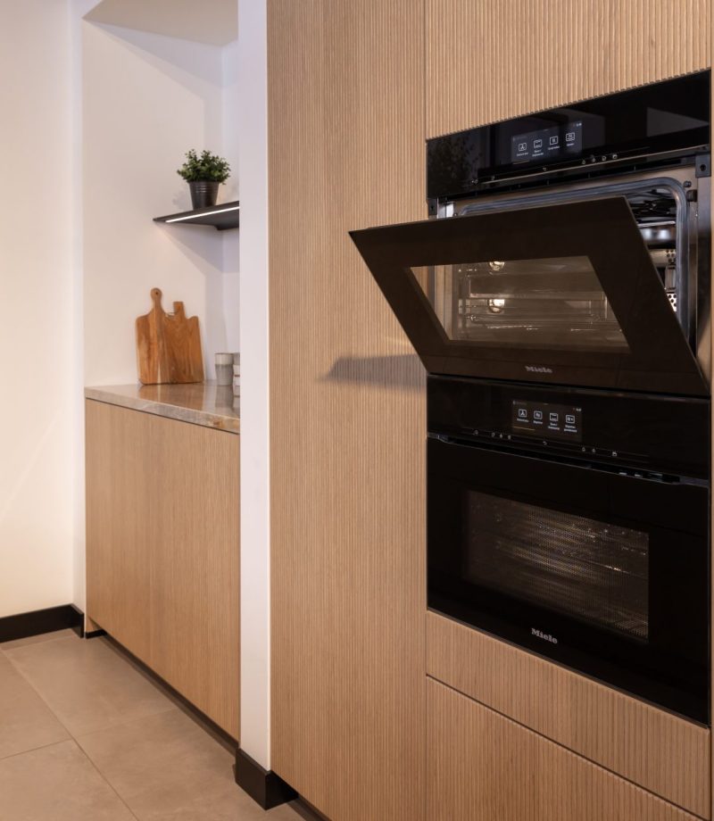 Achter die rustige uitstraling gaat slimme techniek schuil. Ingebouwde apparatuur, stille lades en handige opbergruimte maken het dagelijks gebruik simpel en overzichtelijk. Alles zit waar je het nodig hebt, zonder dat het in het oog springt.