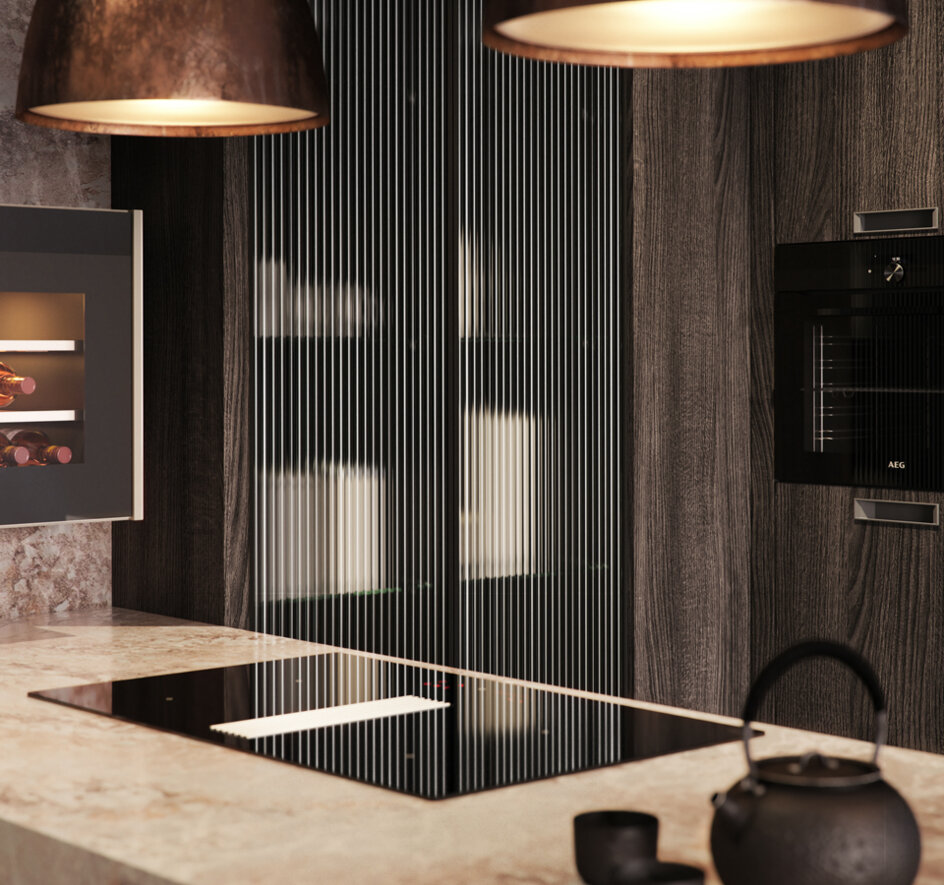 De eyecatcher is de achterwand met ingebouwde wijnkoeler, omlijst door glaskasten met fluted glass. Dit gestructureerde glas voegt diepte toe en geeft een speelse twist aan de keuken. De ingebouwde ledverlichting in de kasten is volledig naar wens instelbaar, zodat de sfeer altijd perfect aansluit bij het moment.