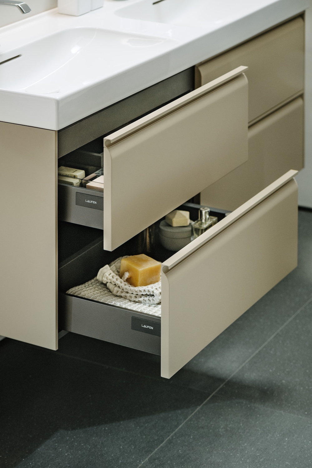 De LANI-meubels bieden talloze kleurmogelijkheden, met een trendy antraciet interieur en een buitenkant in wit, grijs of een van de 40 andere kleuren. Daarnaast zijn er drie speciale kleuren: goud, koper en titanium. Voor meer informatie bezoek je de Laufen website of vraag een brochure aan!