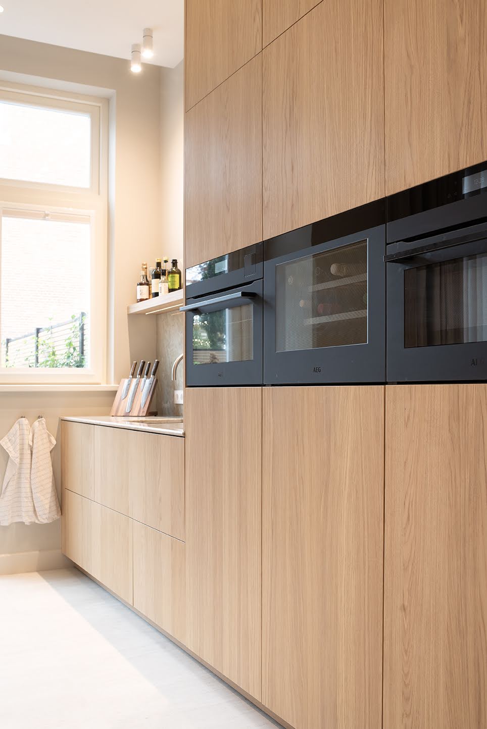 In Den Haag realiseerde Kitchenstudio deze licht eiken designkeuken in Den Haag, in samenwerking met HVM Vastgoed. De keuken is geplaatst in een stadsbenedenwoning en vormt een vast onderdeel van het totale interieurconcept. Het ontwerp is afgestemd op de architectuur van de woning en de wensen van de bewoners.