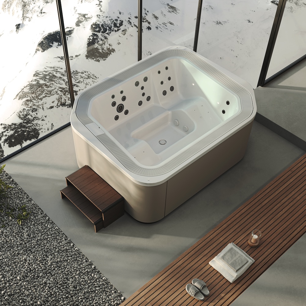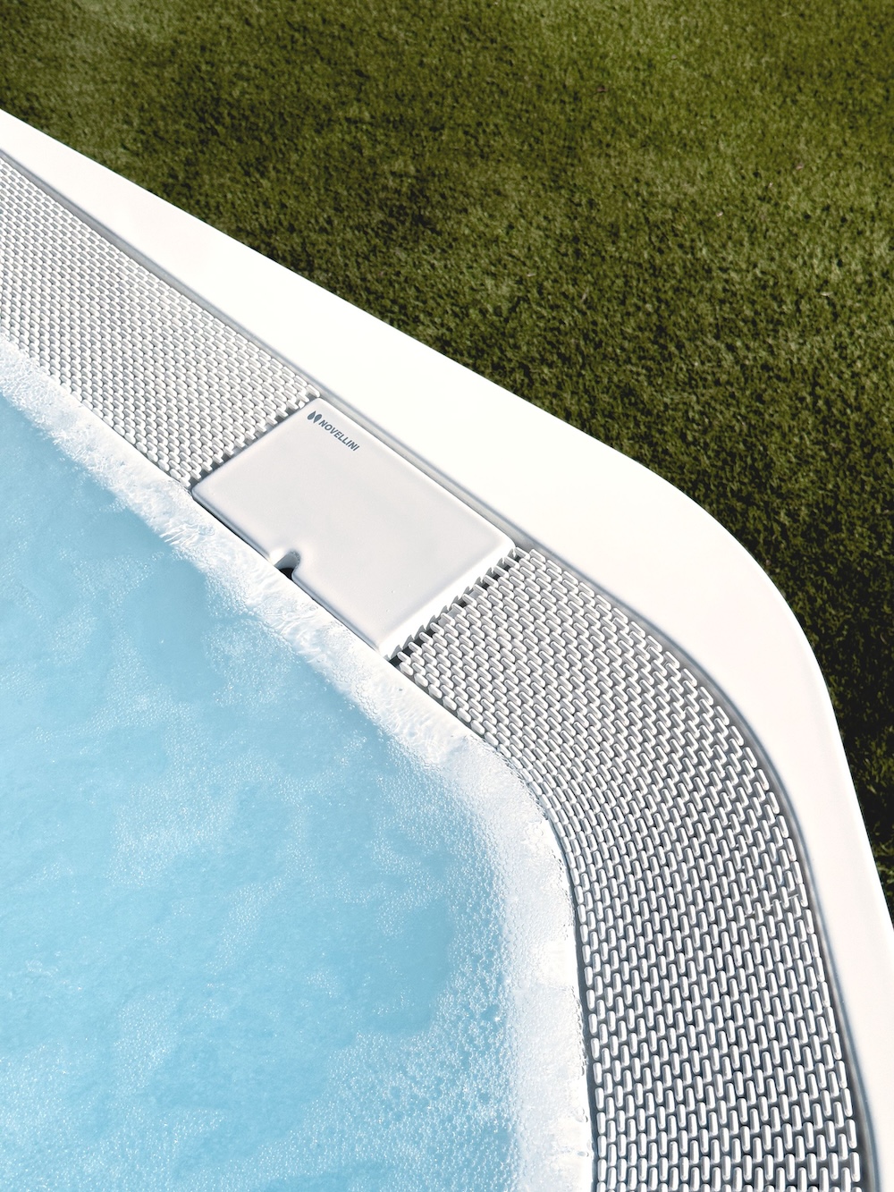 Het ontwerp komt uit de eigen designstudio van Novellini. Daar werken ontwerpers met dezelfde precisie als bij hoogwaardig Italiaans meubeldesign. Elk detail klopt: van de strakke lijnen tot de glanzende overlooprand. Het resultaat is een minimalistische spa met een luxe uitstraling, die naadloos aansluit op moderne architectuur en tuininrichting.