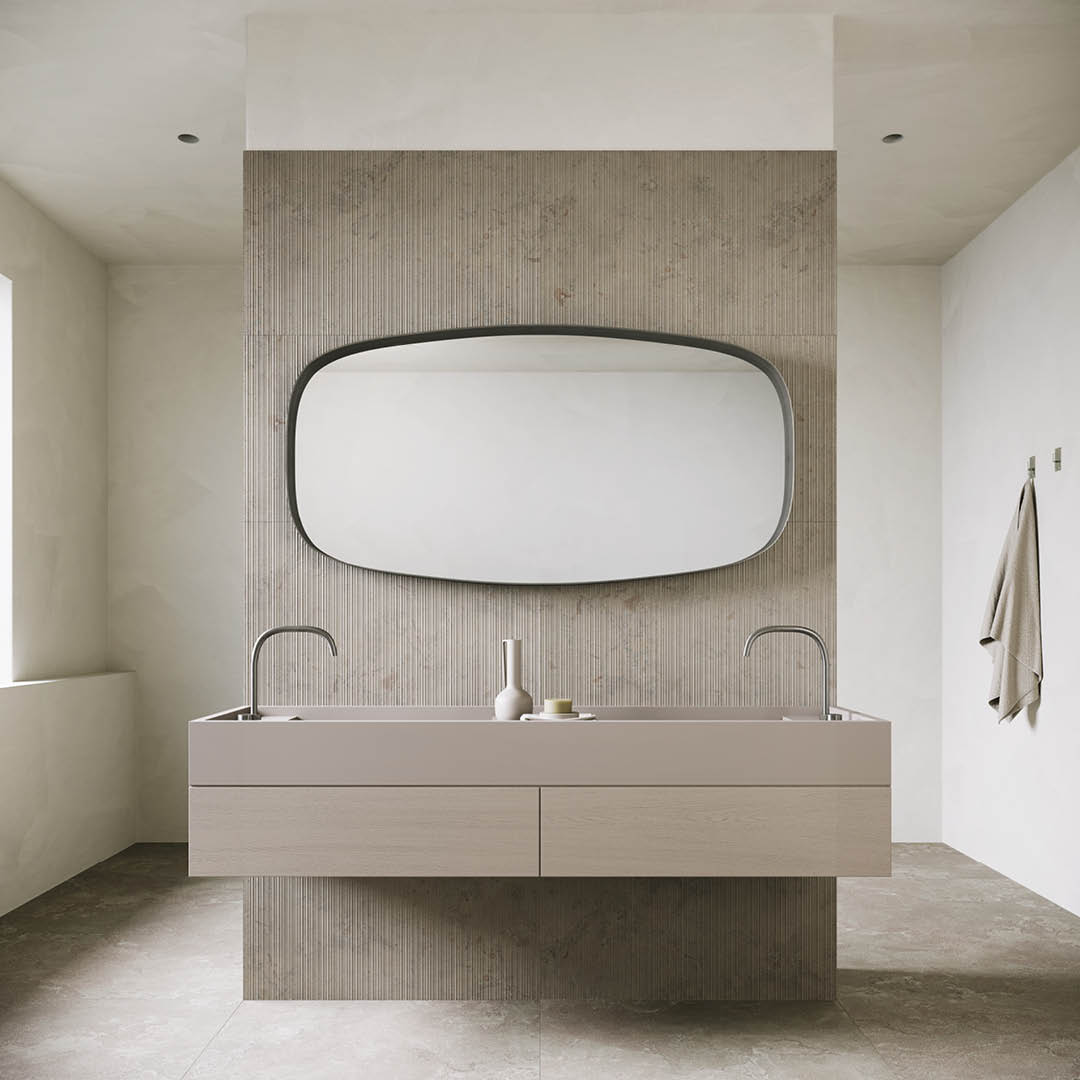 Op de afbeelding zie je de COAST Tile Beige 60x120 cm op de vloer en de COAST Tile Beige Ribbed 60x120 cm op de wand. De COAST Tile is verkrijgbaar in de kleuren Bianco, Beige, Tortora en Cenere en in formaten van 120x120 cm, 80x80 cm, 60x120 cm en 60x120 cm Ribbed.