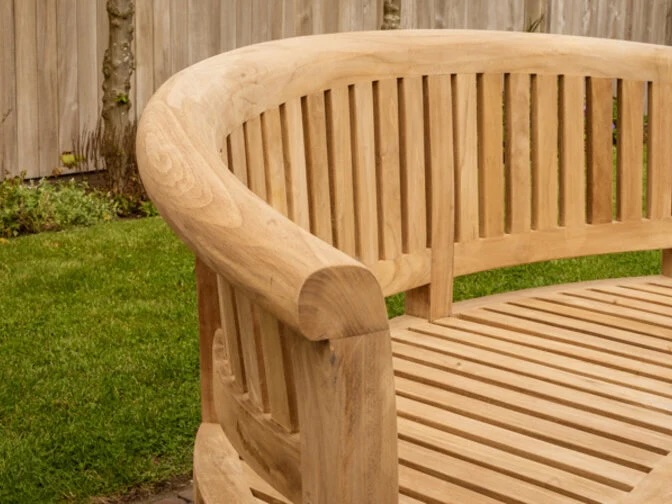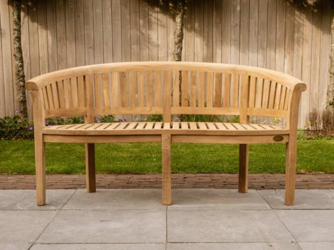 De Washington tuinbank is een echte blikvanger met zijn ronde rugleuning en robuuste constructie dankzij pen-gat verbindingen. Met een breedte van 160 cm, een totale hoogte van 85 cm, een zithoogte van 44 cm en een diepte van 63 cm, biedt deze bank comfort voor twee tot drie personen. Door zijn ronde vorm wordt deze tuinbank ook wel ‘bananenbank’ genoemd – een speels detail dat hem uniek maakt in de tuin.