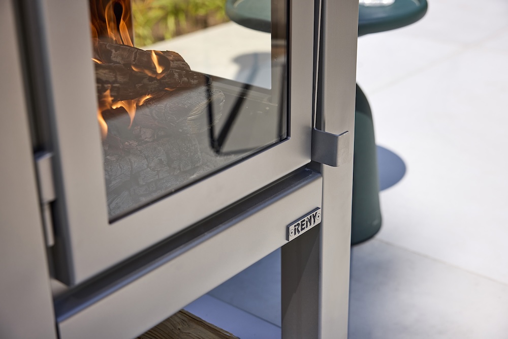 Net als bij de andere modellen stel je de kachel zelf samen: van één tot vier glazen panelen, afhankelijk van hoeveel zicht je wilt op het vuur. De deursluiting is mooi weggewerkt tussen deur en poot, en met het optionele plateau op wieltjes is de kachel eenvoudig te verplaatsen. Extra praktisch: onderin is plek voor een voorraad stookhout.