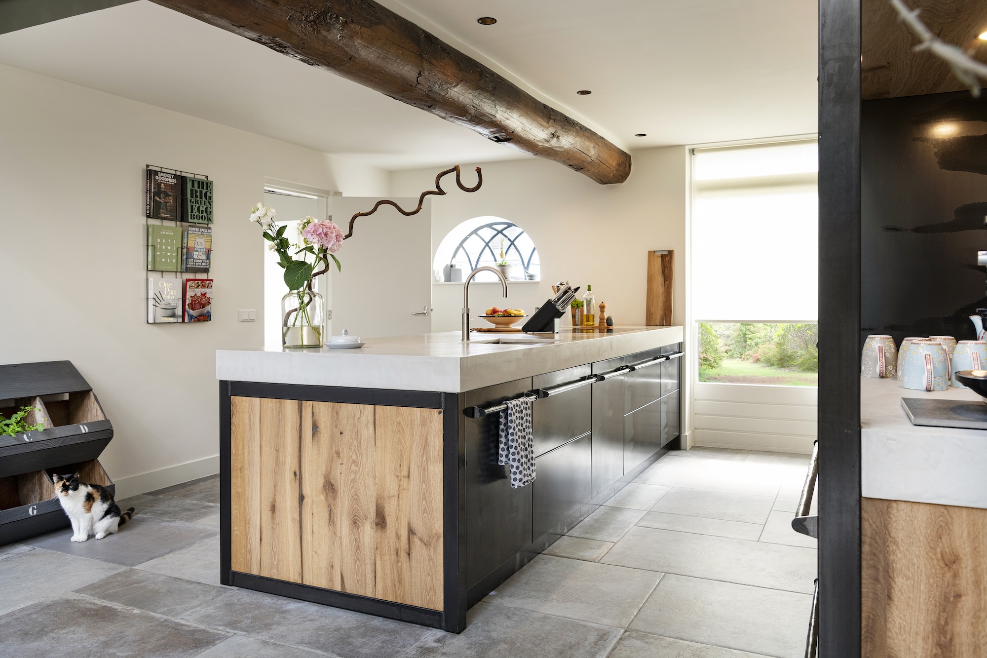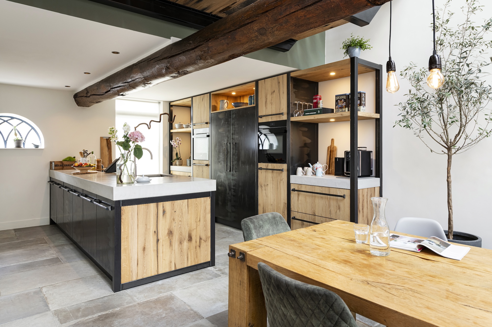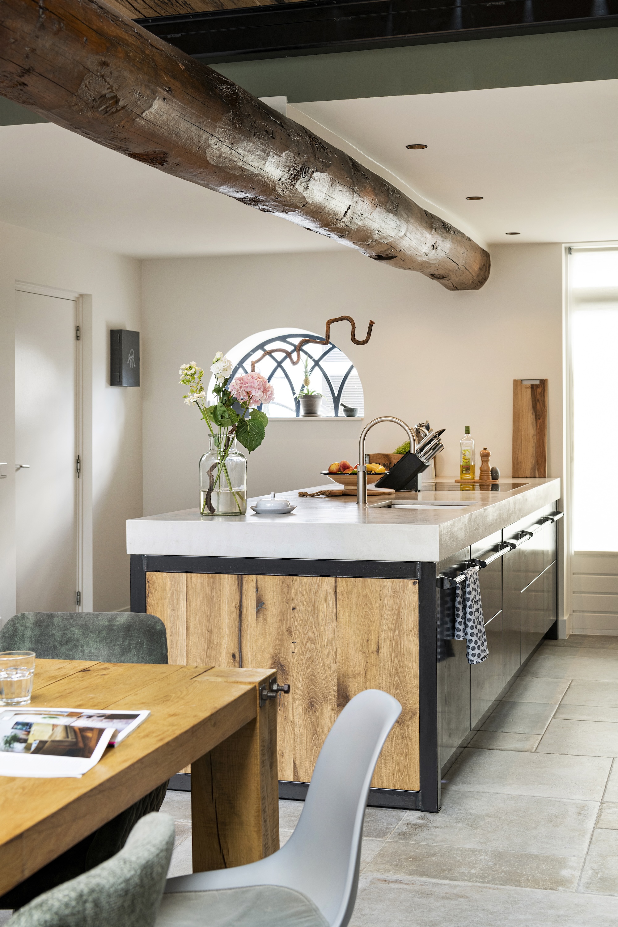 Deze industriële keuken combineert de warmte van geschaafd oud eikenhout met de strakke uitstraling van staal en betonstuc. Het werkblad, uitgevoerd in classic light grey betonstuc, geeft een robuuste en moderne look. De stalen deuren met ingebouwde koelkast en vriezer voegen een uniek industrieel detail toe, compleet met handgemaakte gesmede handgrepen. De keuken bevindt zich in een prachtig gerestaureerde boerderij, waar de charme van blauwstaal met zichtbare vlammen perfect aansluit op de omgeving.