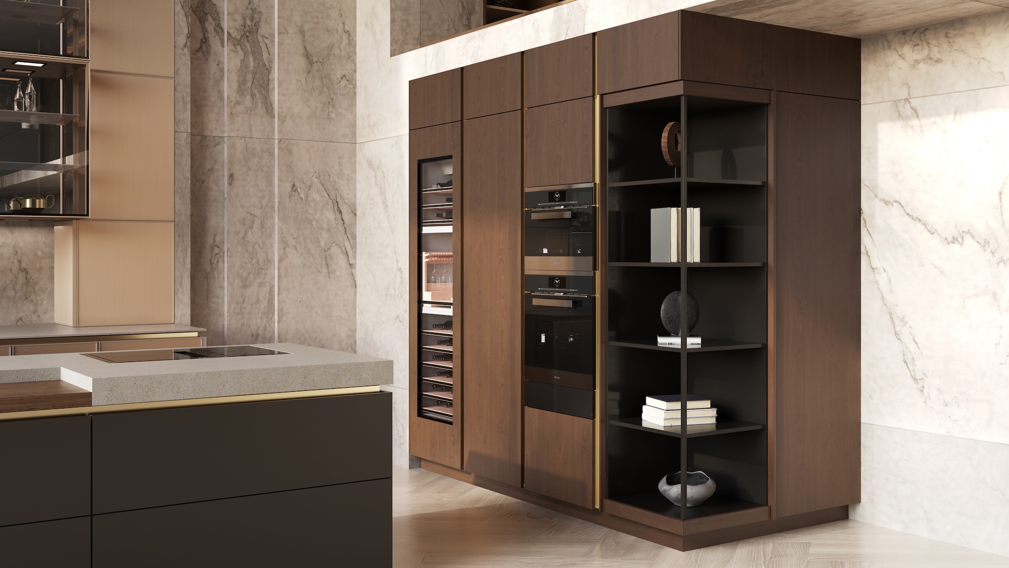 Met de S2 kunnen gesloten keukenkasten gemakkelijk worden omgetoverd tot mooie open vitrines. De kookplaat blijft discreet verborgen onder schuifbare werkbladen en keukenapparaten worden opgeborgen achter handige schuifdeuren.