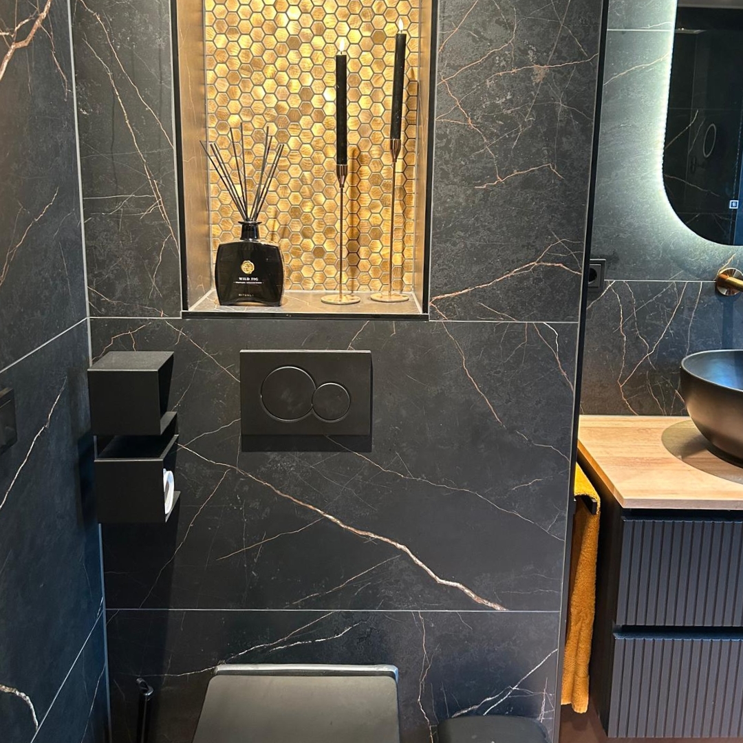 Bij Tegeldepot stel je eenvoudig een complete badkamer samen die volledig aansluit bij jouw stijl en wensen. De zwarte badkamer met marmerlook combineert donkere en koperen accenten voor een mysterieuze, luxe uitstraling die direct opvalt. De koperbruine wastafel en het marmerlook topblad zijn echte eyecatchers en vormen het hart van de badkamer. De halfronde spiegel met geïntegreerde LED-verlichting voegt een sfeervolle ambiance toe, perfect om de dag in stijl te beginnen of af te sluiten. Een koperen regendouche set tilt de douche-ervaring naar een ongekend niveau van luxe.