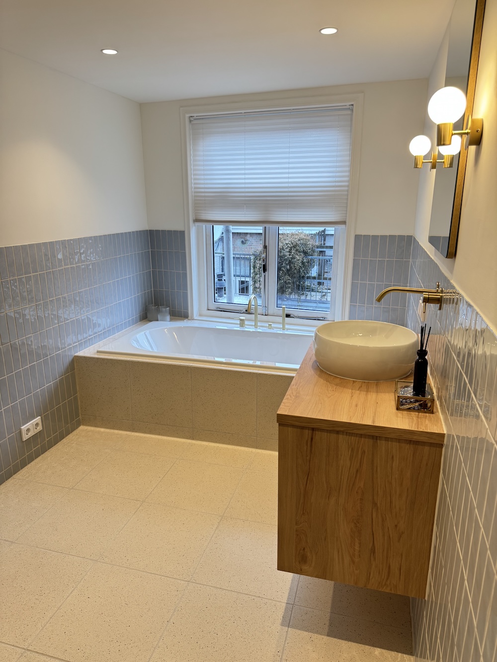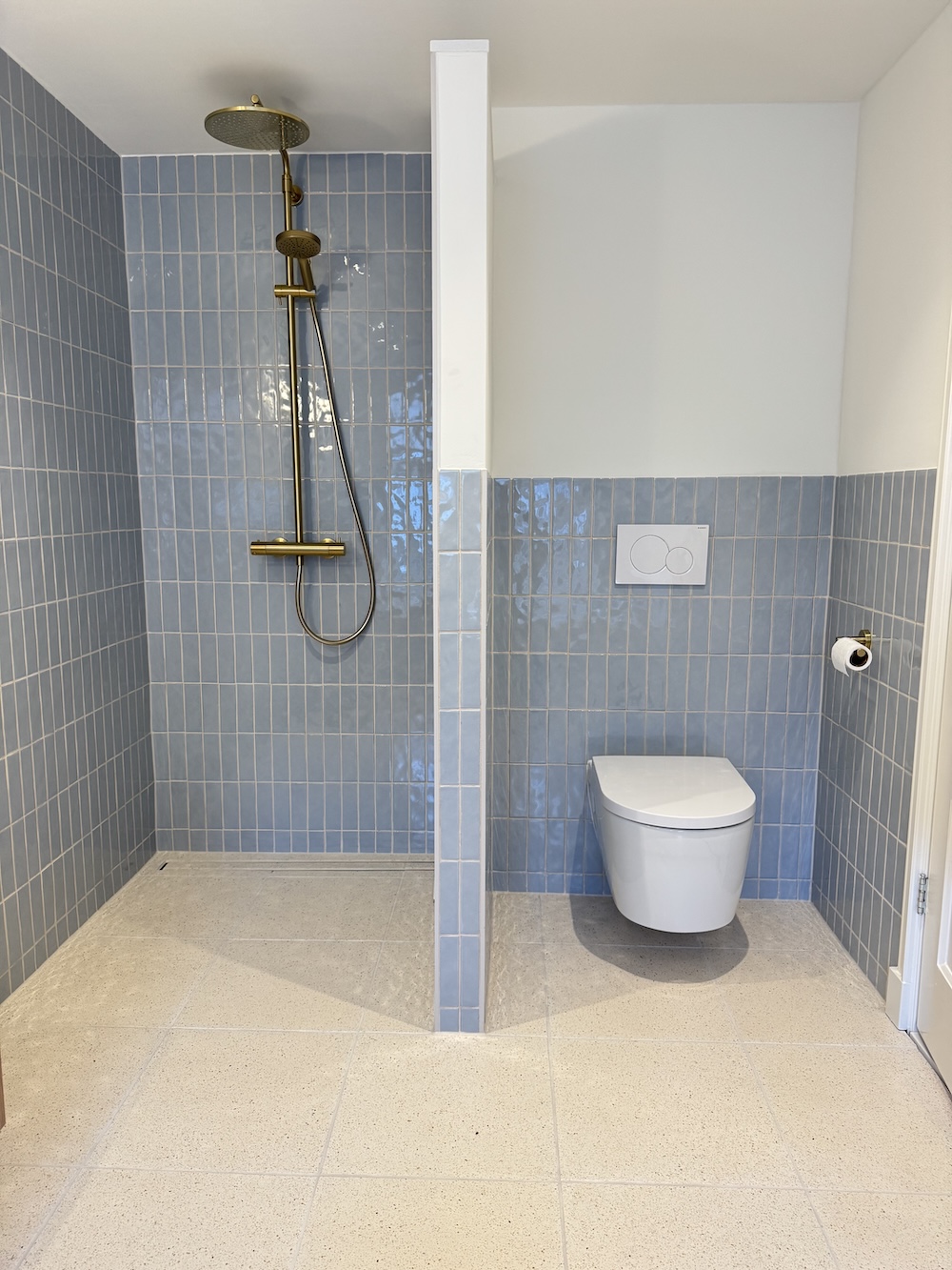De combinatie van deze twee tegels werkt omdat ze elkaar aanvullen. De rustige basis van terrazzo, met daartegenover de gelaagde, lichtspelende wand. Samen brengen ze balans, met precies genoeg spanning om het interessant te houden.