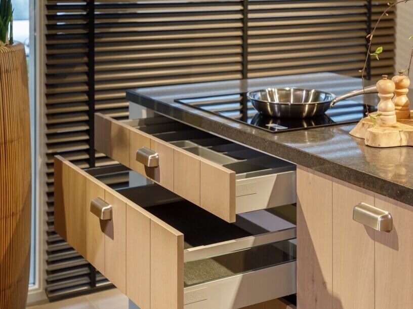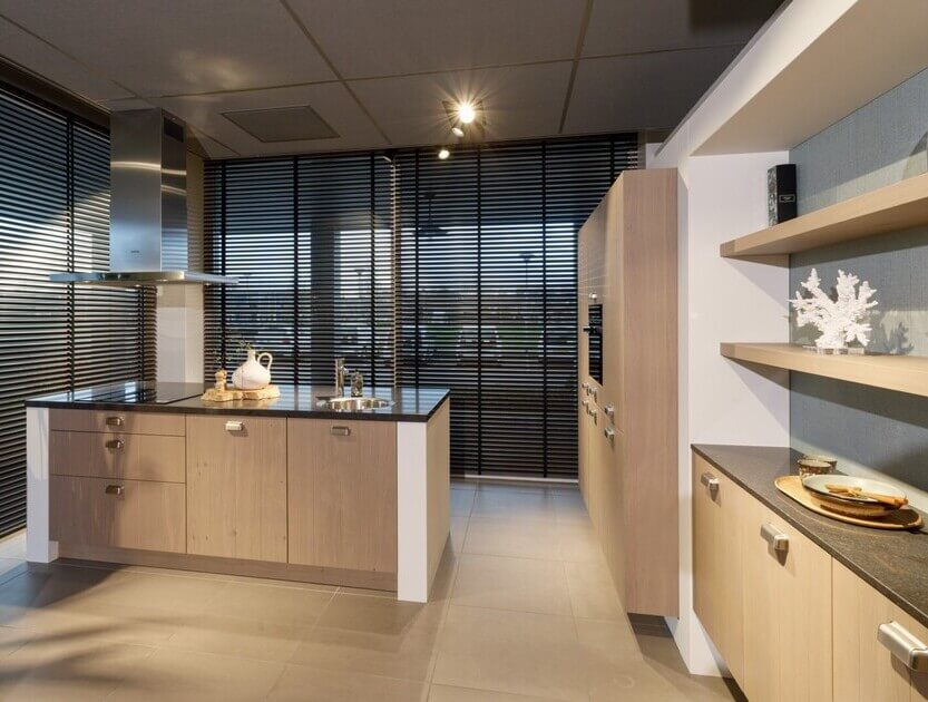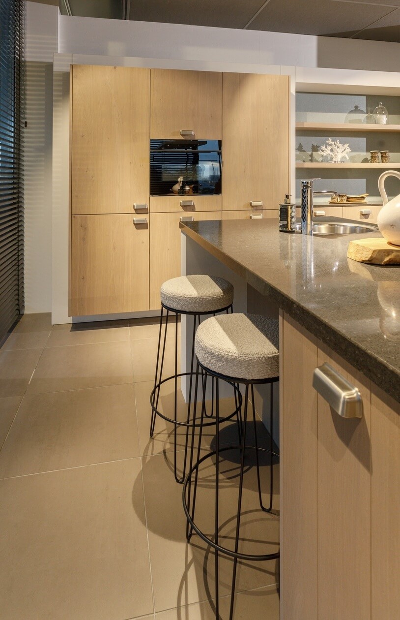 De groeven geven de keuken een speelse, unieke uitstraling. Je kunt de afstand tussen de groeven aanpassen naar wens, met opties om ze om de 5, 10, 15 of 20 cm te plaatsen. Zelfs een enkele groef in het midden van het front is mogelijk. Hierdoor kun je de look helemaal naar je eigen smaak afstemmen. Je kunt deze keuken bewonderen in de showroom van Tieleman Keukens!