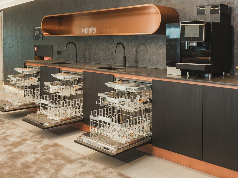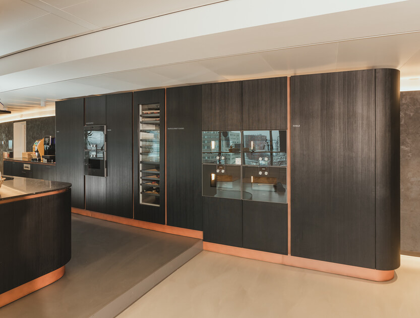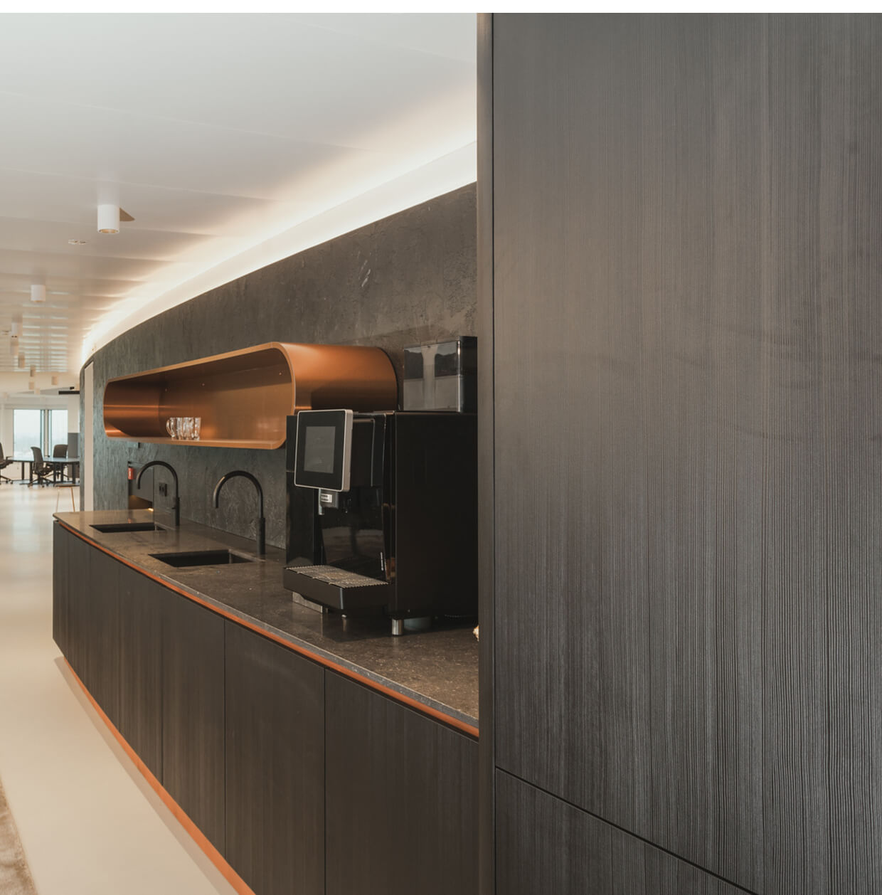 Deze Mereno bedrijfskeuken in het WTC Rotterdam, geplaatst door Tieleman Keukens, valt op door de zwarte afwerking met houtnerf en luxe koperen details. Dit zorgt voor een moderne en chique uitstraling, perfect voor een zakelijke omgeving. De combinatie van zwart met hout en koper maakt de keukens stijlvol én tijdloos.