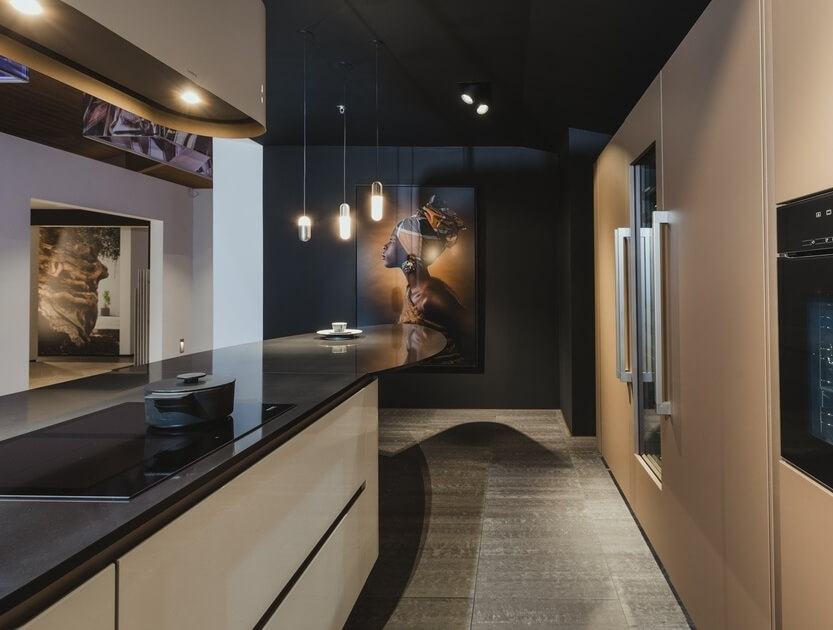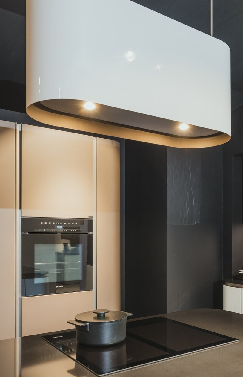 De afgeronde kasten en zachte lijnen zorgen voor een moderne en sfeervolle uitstraling. Ook de verlichting boven het barblad volgt deze vloeiende vormen, wat de keuken een unieke look geeft.