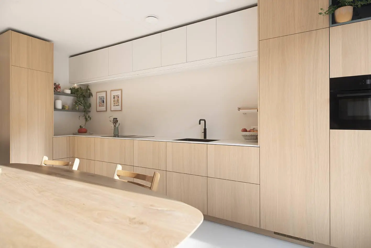 De fronten zijn uitgevoerd in speciaal eiken fineer met een dunne toplaag. Dit zorgt voor een verfijnde en natuurlijke uitstraling. In de gehele keuken is gekozen voor een push to open systeem, waardoor grepen achterwege blijven. Daarnaast is de laden look toegepast. Grote fronten zijn optisch verdeeld in meerdere ladevlakken terwijl ze technisch één geheel vormen. Dit draagt bij aan een consistent en rustig frontbeeld.