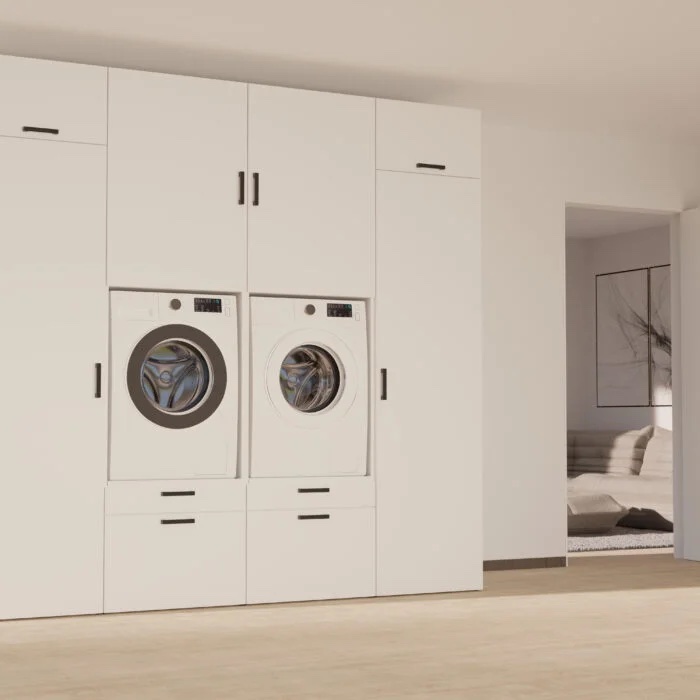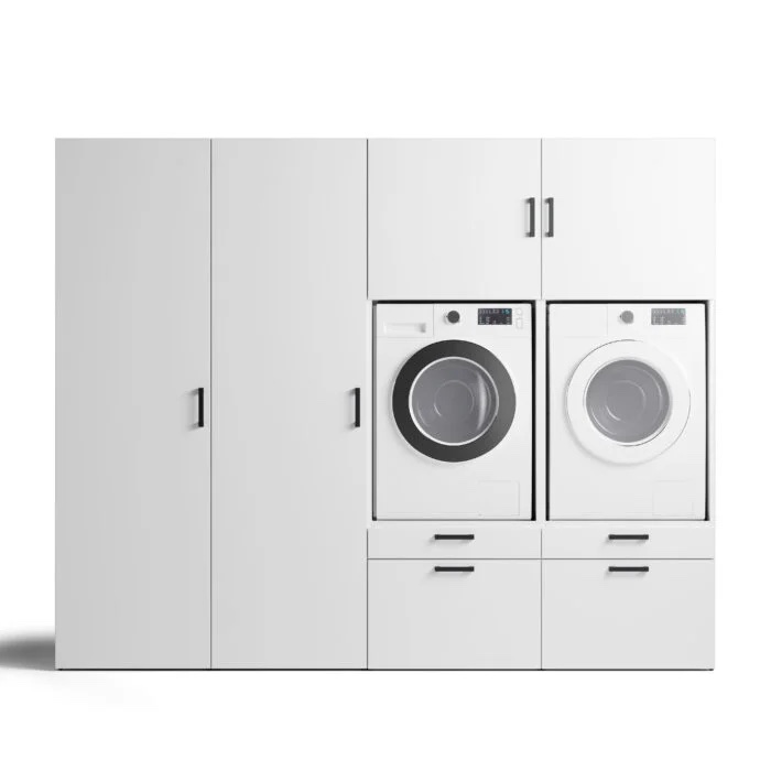 Ben je op zoek naar praktische en stijlvolle kasten waar de wasmachine en droger in passen? Bij Wasombouw vind je de ideale oplossing. De witte wasmachinekasten zijn gemaakt van hoogwaardig vochtbestendig MDF-materiaal en bieden functionele opbergruimte voor de bijkeuken of wasruimte. Met een indrukwekkend draagvermogen van 300KG per kast en het gerenommeerde Duitse TÜV-veiligheidskeurmerk ben je verzekerd van kwaliteit en veiligheid.