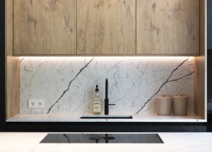 Het keukenbedrijf heeft gekozen voor een helder en doordacht ontwerp, waarin maatwerk en materiaalgebruik centraal staan. De keuken is volledig afgestemd op de ruimte en ontworpen als vast onderdeel van het interieur, niet als los element. De hoge kastenwand versterkt de ruimtelijkheid en benadrukt de hoogte van de villa, terwijl de strakke belijning zorgt voor rust en samenhang.