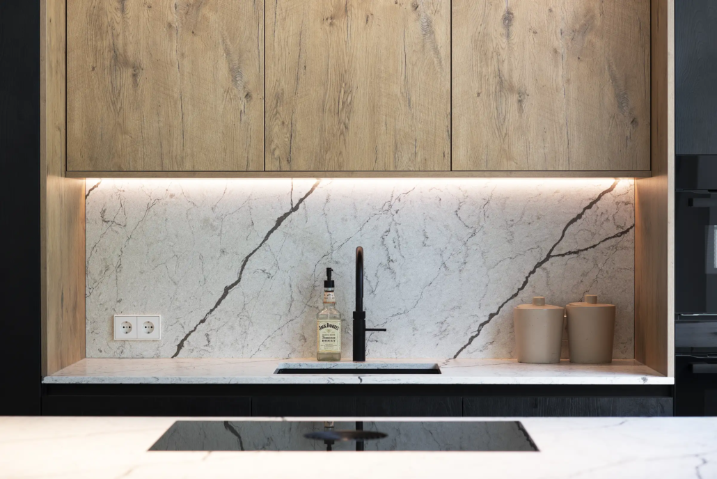 Zwart melamine vormt de basis van het ontwerp en geeft de keuken een solide en krachtige uitstraling. De warme eiken houtlook zorgt voor contrast en brengt een natuurlijke gelaagdheid aan. Het composiet werkblad voegt een verfijnde en functionele afwerking toe en is doorgezet in zowel het kookeiland als de achterwand. De combinatie van donkere fronten, houtstructuur en lichte steentinten zorgt voor een uitgebalanceerd geheel.